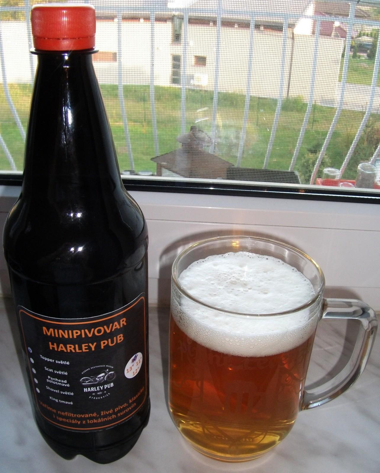 Půllitr vyfocen i s lahví, těsně po přelití, je celý, správně barevný, není pootočený a zabírá naprostou většinu obrázku.
